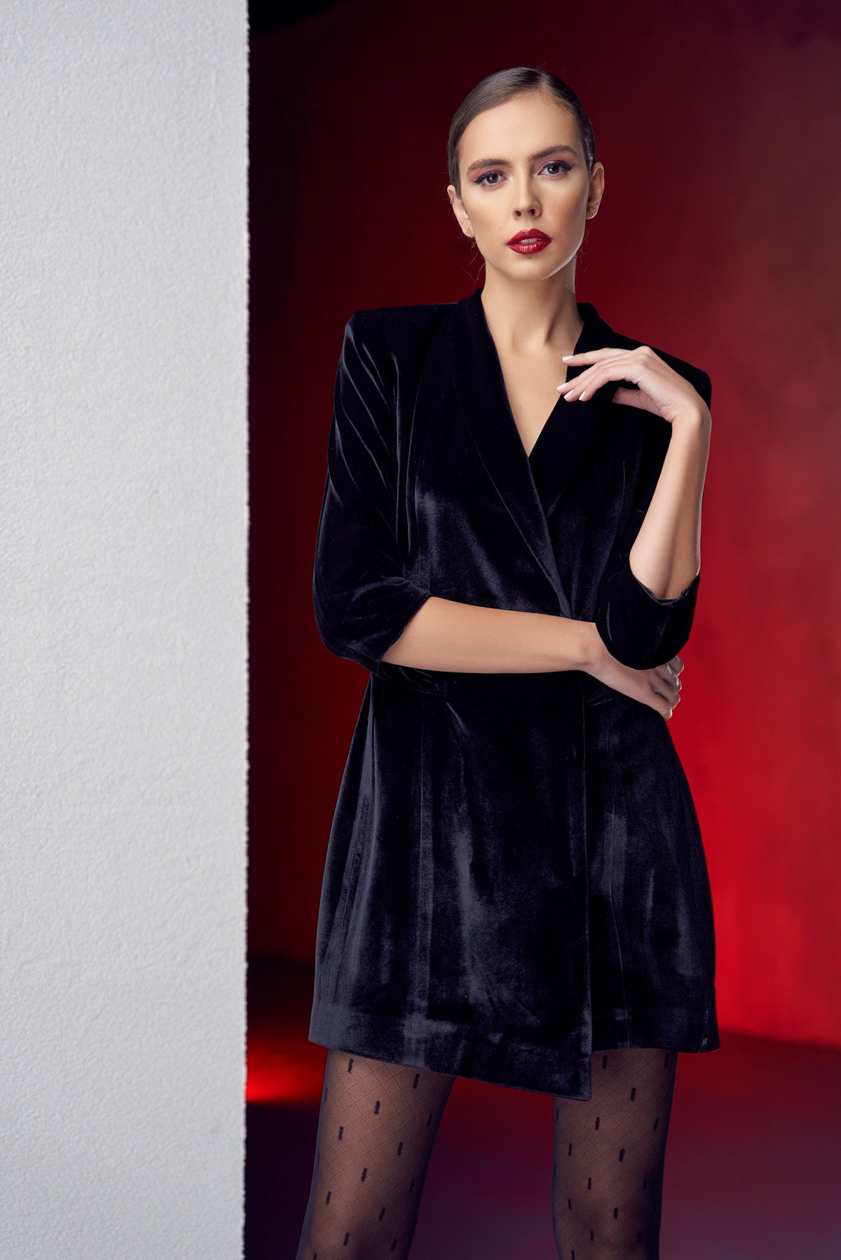 Houndstooth Wool Blazer Dress With Contrast Belt