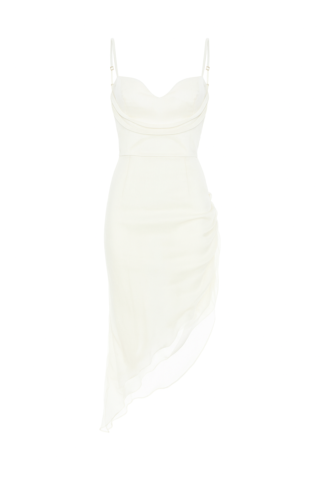 Asymmetric Silk Midi Dress With Straps And Side Gathering - Ivory