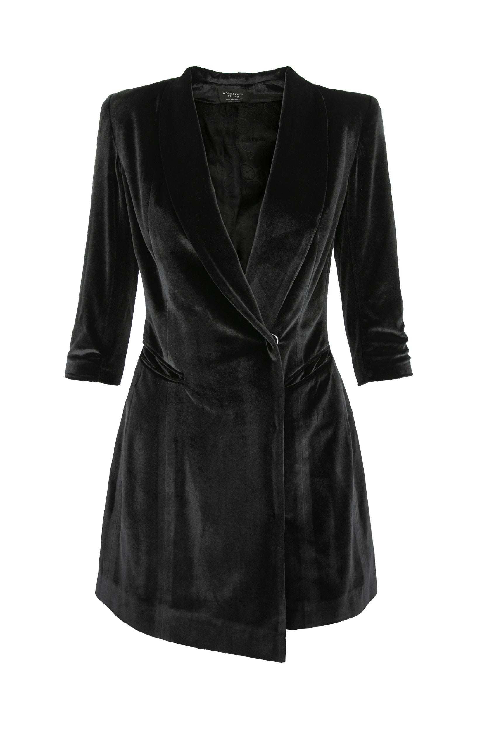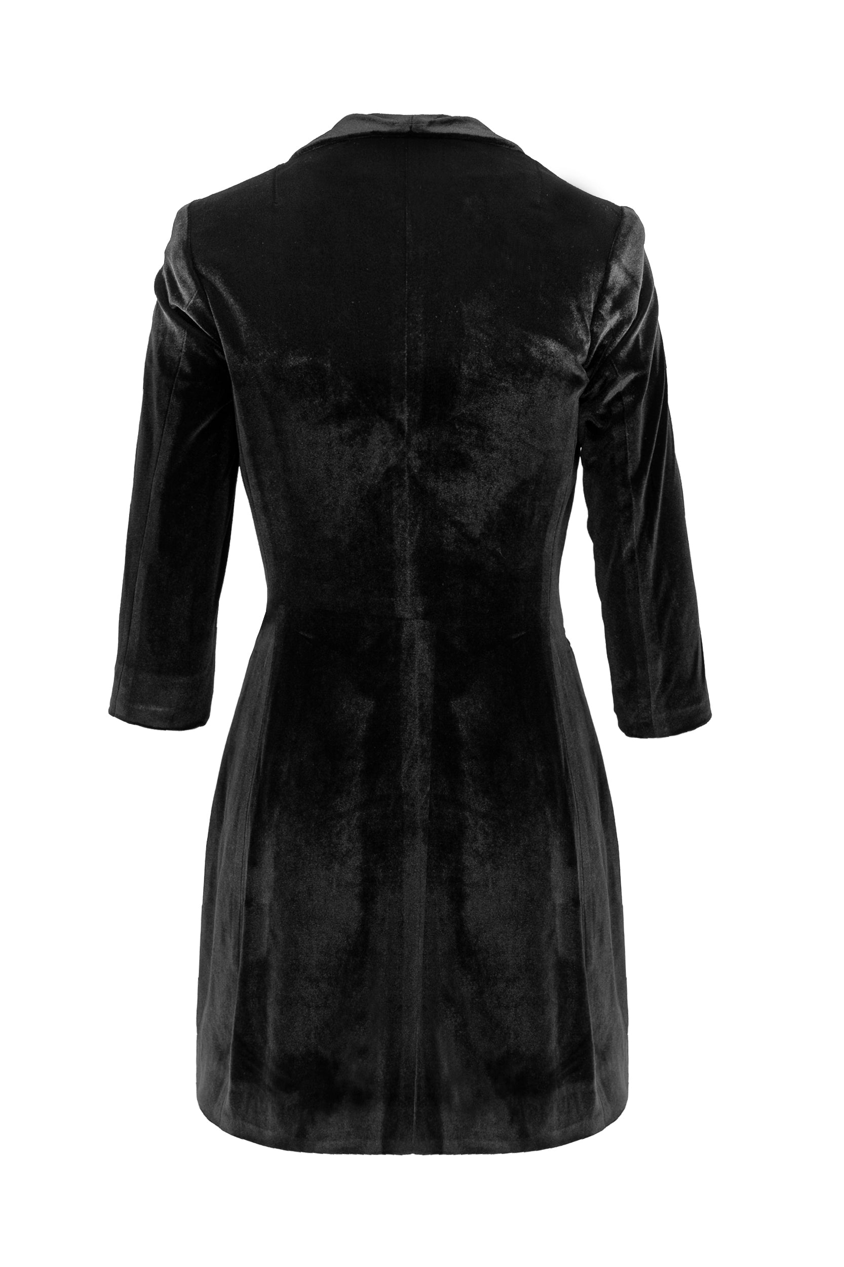 This Black Asymmetric Velvet Blazer Dress features a sleek A-line silhouette and three-quarter sleeves, perfect for polished cocktail events. Designed with subtle yet refined details, diagonal welt pockets, padded shoulders, and invisible buttoning, it exudes elegance and timeless style. The velvet-finished fabric combines modern tailoring with classic allure making it ideal for business gatherings or an evening date.