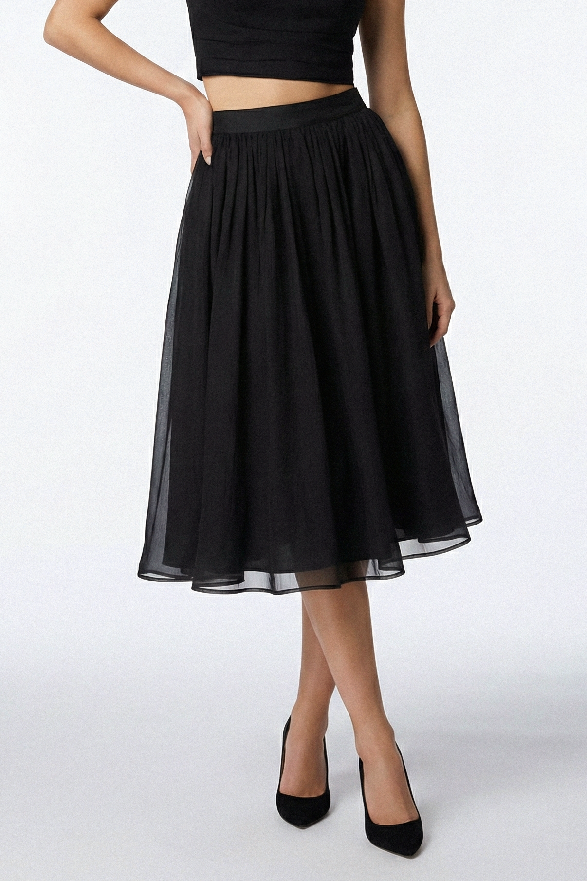 This black gathered silk midi skirt, crafted from luxurious silk voile, is a versatile and timeless piece perfect for any capsule collection. Its elegant design transitions effortlessly from casual daytime wear to chic cocktail evenings. Soft and flowing, it pairs beautifully with both relaxed and refined styles, making it an essential staple that adapts seamlessly to every occasion.