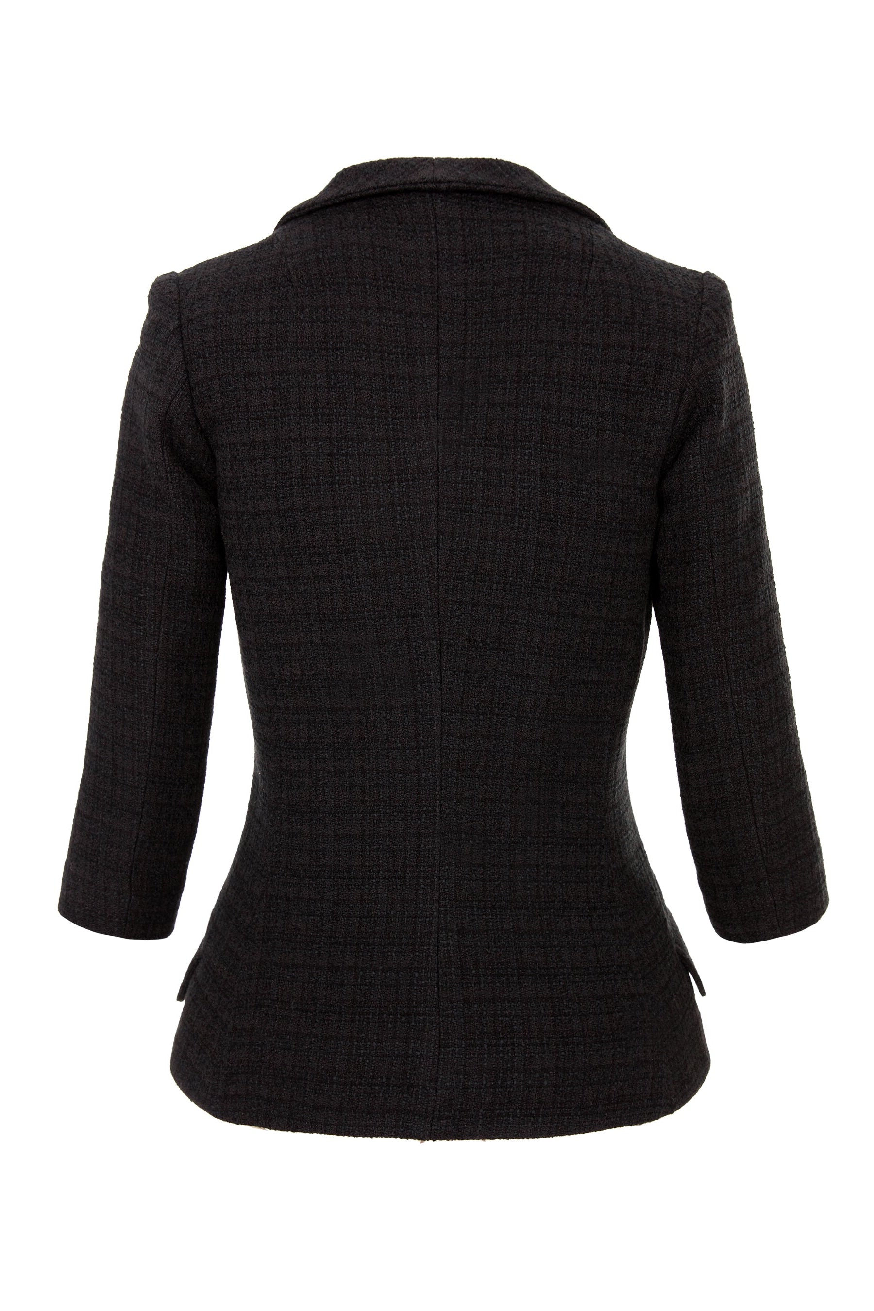 With a traditional shawl lapel and slim waistline, this structured boucle blazer with three quarter sleeves is the perfect choice for an elegant business or cocktail look. It features a flattering A line silhouette and a perfect length. Its versatility and timeless elegance make it an important piece of the wardrobe that can easily be paired with a cocktail dress or black trousers.